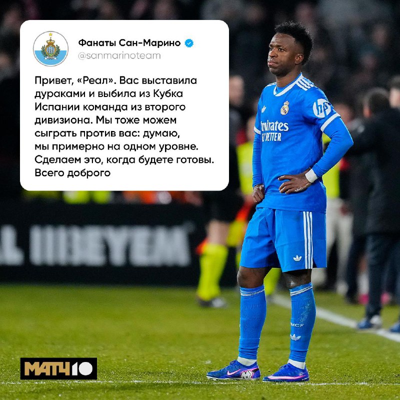 #спорт#новостиФан-аккаунт сборной Сан-Марино кинул вызов «Реалу». Арбелоа, готов принять?15 января 2026, 14:58 · По материалам: МатчТВФан-аккаунт сборной Сан-Марино кинул вызов «Реалу». Арбелоа, готов принять?00