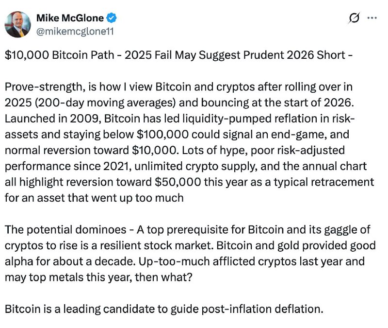 Макглоун называет шорт биткоина в 2026 году «разумной стратегией» и указывает на перегрев рынка, слабую доходность с учётом рисков с 2021 года и избыток криптоактивов. Он также отмечает зависимость BTC от устойчивости фондового рынка и допускает, что биткоин может стать индикатором дефляционного этапа после инфляционного цикла.