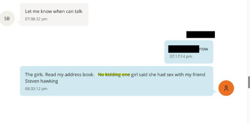 — Без шуток, одна из девушек сказала, что у неё был секс с моим другом Стивеном Хокингом.